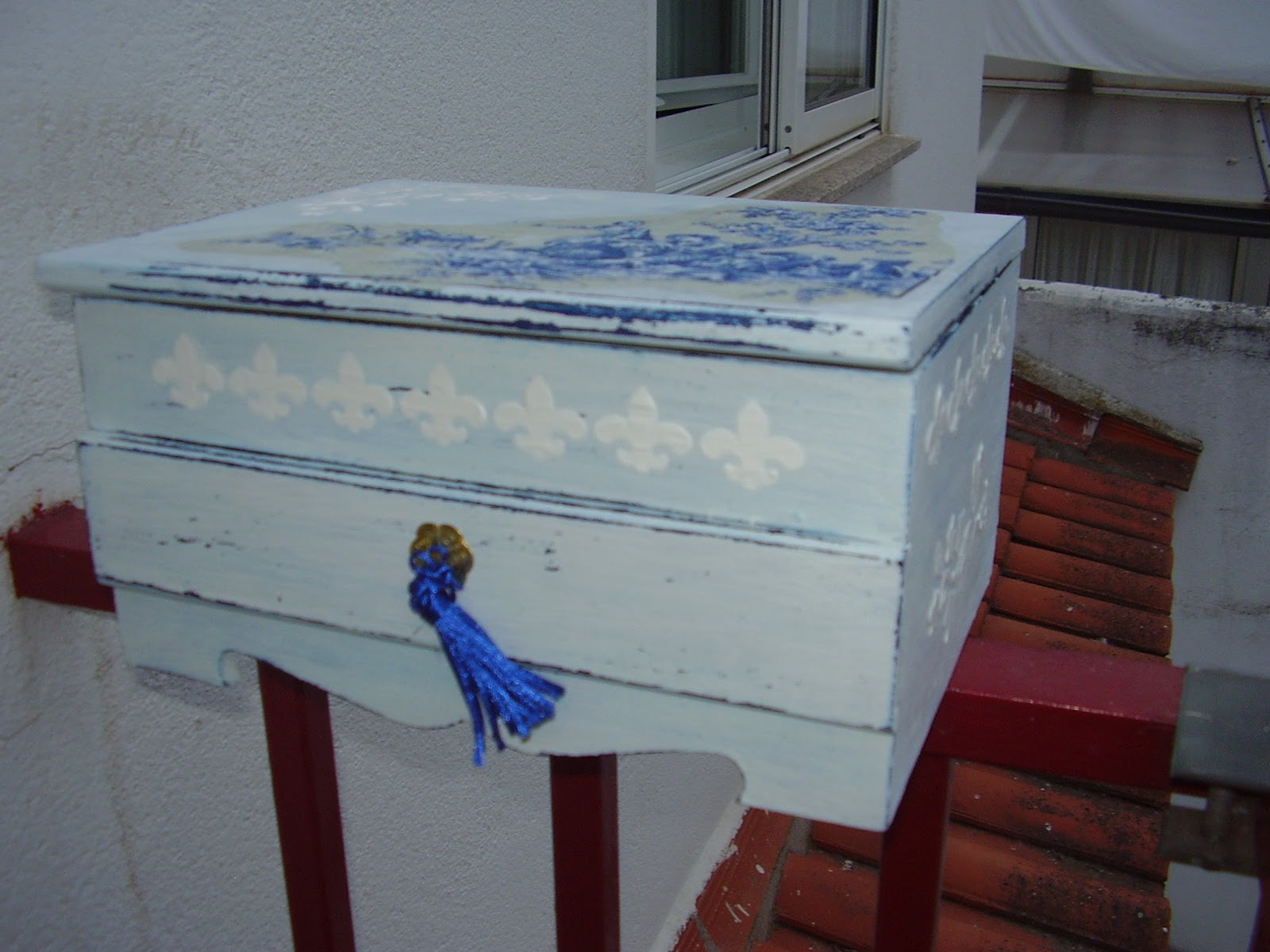 Y este es el joyero. en tono azul como a ella le gusta.Está decorado con servilletas, con láminas de stencil y con gesso, y con la técnica de la vela que tanto me gusta. La caja es de los chinos